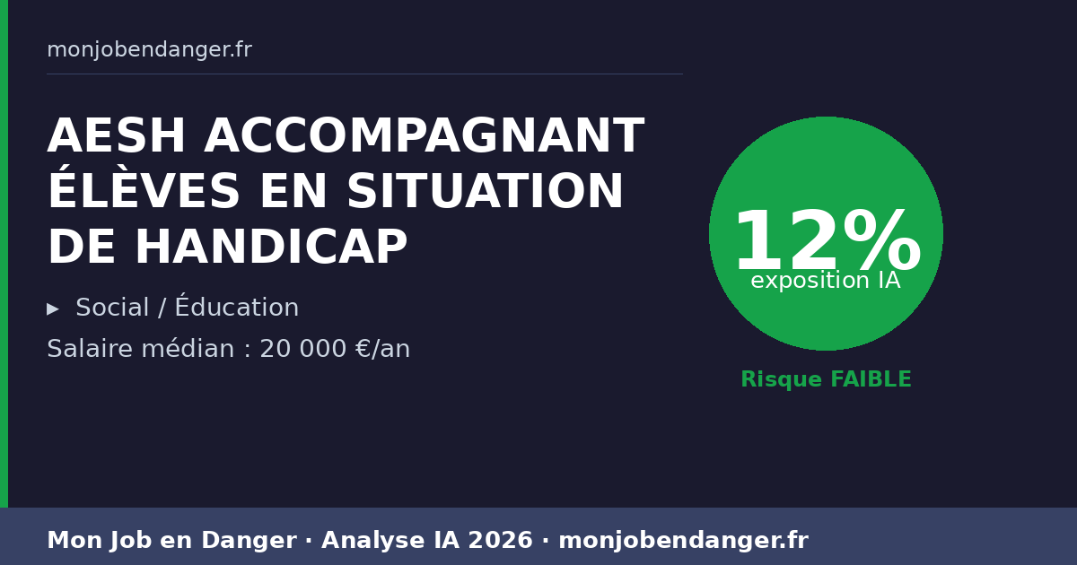Avec seulement 12% d’exposition, les AESHs ACCOMPAGNANT ÉLÈVES EN SITUATION DE HANDICAP bénéficient d’une forte résilience face à l’IA. La dimension physique, relationnelle ou créative de ce métier le protège naturellement.