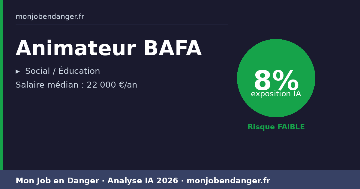 Avec seulement 8% d’exposition, les Animateurs BAFA bénéficient d’une forte résilience face à l’IA. La dimension physique, relationnelle ou créative de ce métier le protège naturellement.