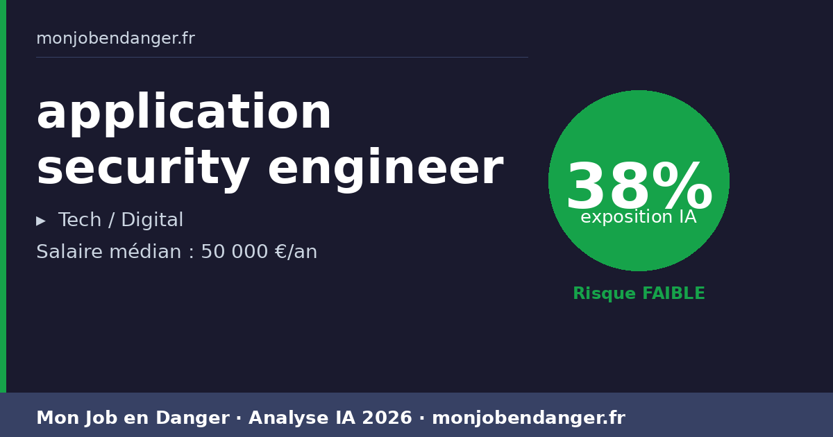 Avec seulement 38% d’exposition, les applications security engineer bénéficient d’une forte résilience face à l’IA. La dimension physique, relationnelle ou créative de ce métier le protège naturellement.