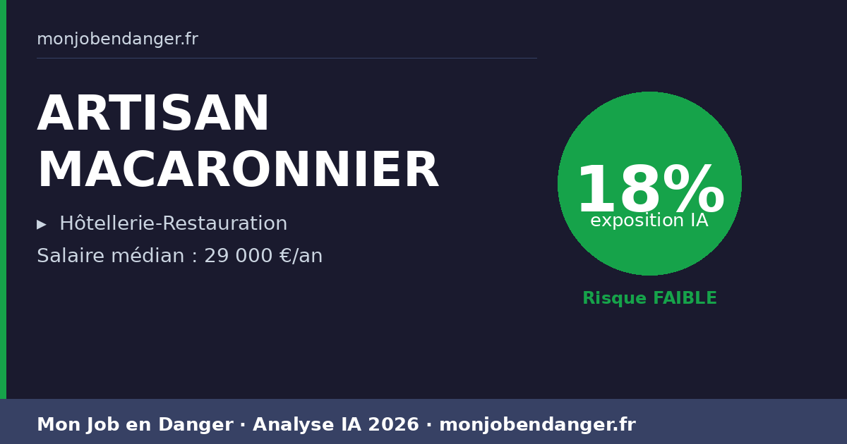 Avec seulement 18% d’exposition, les ARTISANs MACARONNIER bénéficient d’une forte résilience face à l’IA. La dimension physique, relationnelle ou créative de ce métier le protège naturellement.