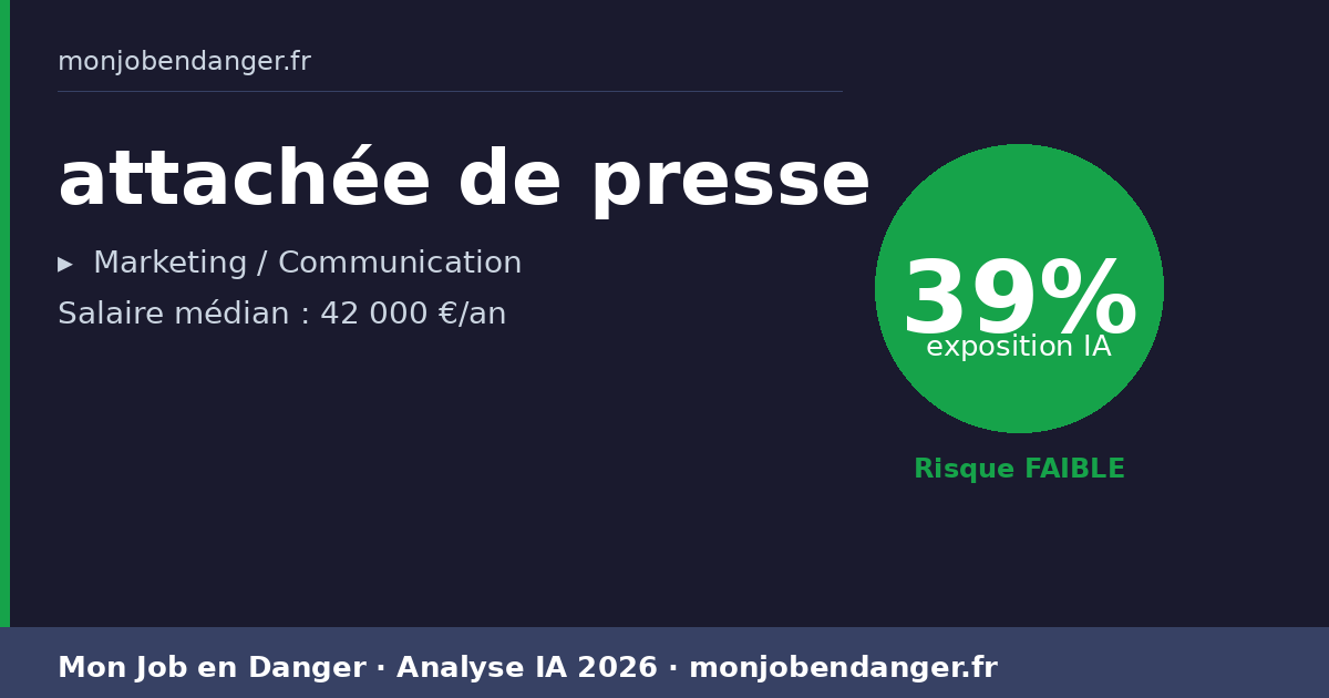 Dimensions d’exposition IA pour attachée de presse : Rédaction & communication: 32%, Données & analyse: 20%, Code & raisonnement: 17%, Design & création: 13%, Travail physique: 23%, Relations humaines: 35%.