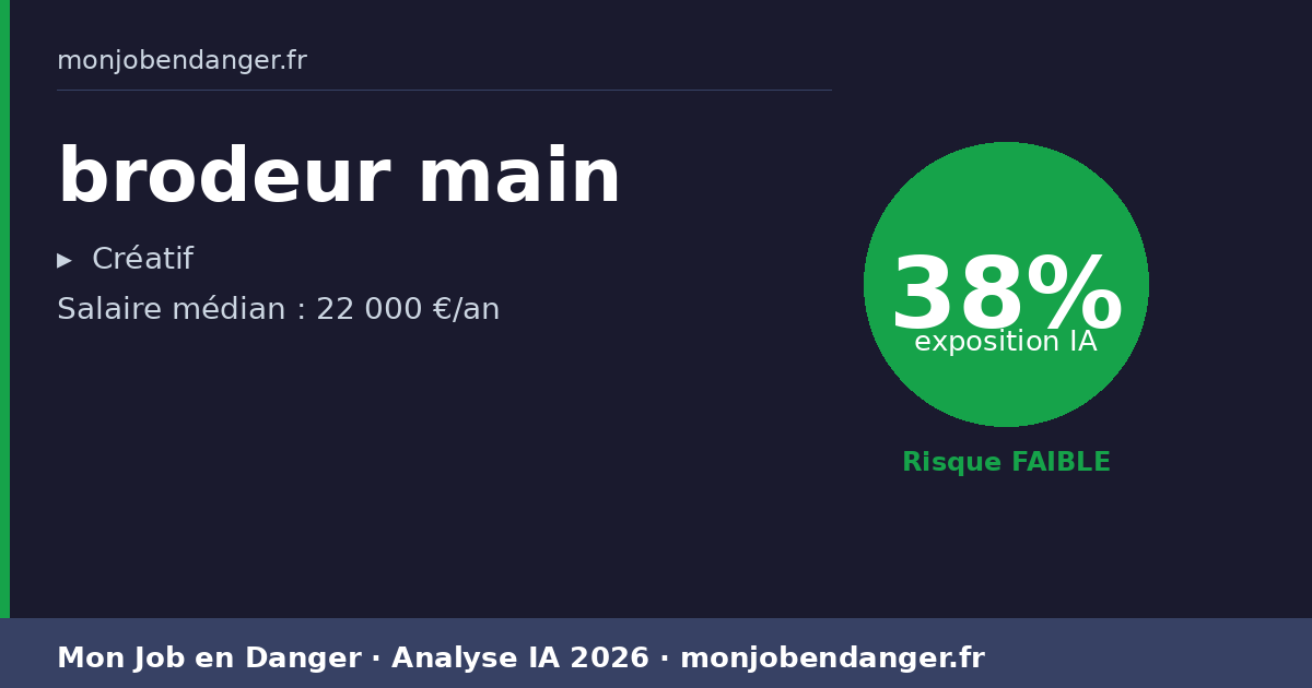 Avec seulement 38% d’exposition, les brodeurs main bénéficient d’une forte résilience face à l’IA. La dimension physique, relationnelle ou créative de ce métier le protège naturellement.