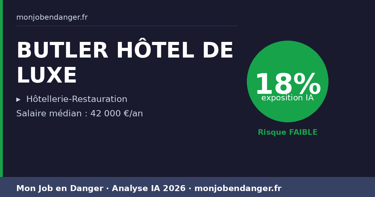 Avec seulement 18% d’exposition, les BUTLERs HÔTEL DE LUXE bénéficient d’une forte résilience face à l’IA. La dimension physique, relationnelle ou créative de ce métier le protège naturellement.