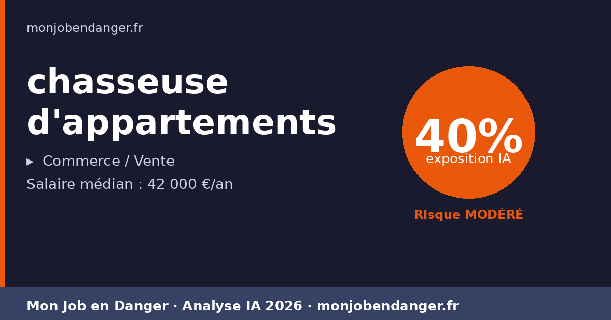 À 40% d’exposition, les chasseuse d'appartements vivent une mutation progressive. Certaines tâches seront assistées par l’IA, d’autres resteront pleinement humaines. Votre meilleure stratégie : adopter les outils IA pour amplifier votre productivité.