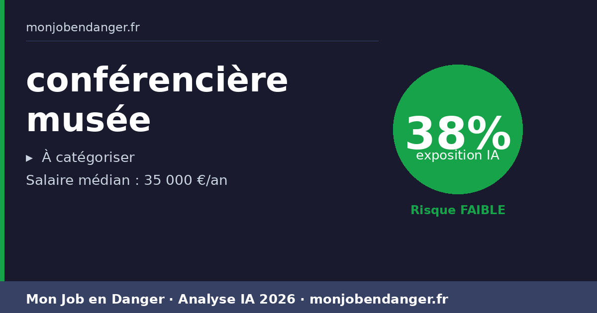Avec seulement 38% d’exposition, les conférencières musée bénéficient d’une forte résilience face à l’IA. La dimension physique, relationnelle ou créative de ce métier le protège naturellement.