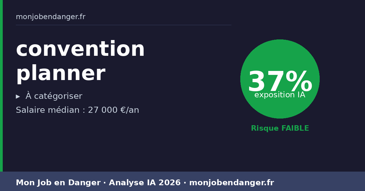Avec seulement 37% d’exposition, les conventions planner bénéficient d’une forte résilience face à l’IA. La dimension physique, relationnelle ou créative de ce métier le protège naturellement.