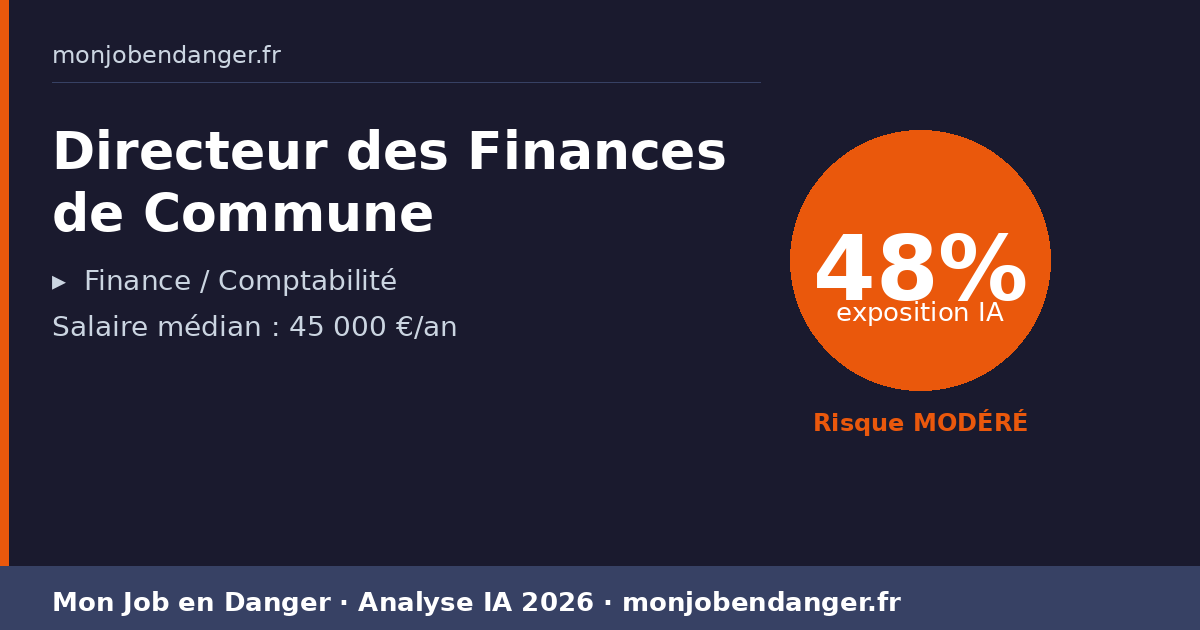 L'IA va fortement automatiser la production des états et l'analyse des écarts budgétaires, réduisant le temps passé sur les tâches techniques comptables. Le métier se déplace vers le conseil politique et la négociation, ce qui rend le directeur financier plus indispensable mais aussi plus exposé à la réduction des effectifs dans les petites communes.