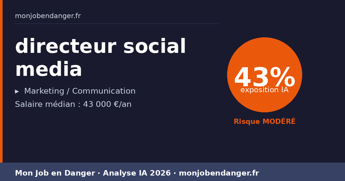 Dimensions d’exposition IA pour directeur social media : Rédaction & communication: 40%, Données & analyse: 22%, Code & raisonnement: 19%, Design & création: 10%, Travail physique: 25%, Relations humaines: 37%.