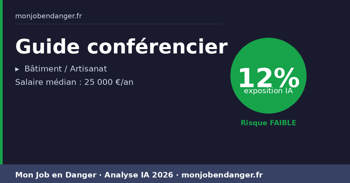 Avec seulement 12% d’exposition, les Guides conférencier bénéficient d’une forte résilience face à l’IA. La dimension physique, relationnelle ou créative de ce métier le protège naturellement.