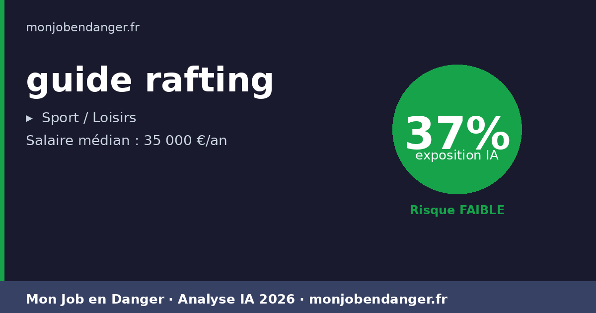Avec seulement 37% d’exposition, les guides rafting bénéficient d’une forte résilience face à l’IA. La dimension physique, relationnelle ou créative de ce métier le protège naturellement.