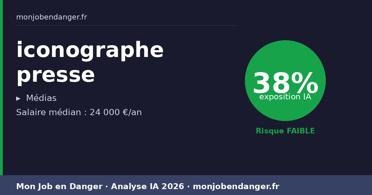 Avec seulement 38% d’exposition, les iconographes presse bénéficient d’une forte résilience face à l’IA. La dimension physique, relationnelle ou créative de ce métier le protège naturellement.