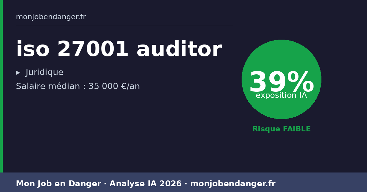 Avec seulement 39% d’exposition, les isos 27001 auditor bénéficient d’une forte résilience face à l’IA. La dimension physique, relationnelle ou créative de ce métier le protège naturellement.