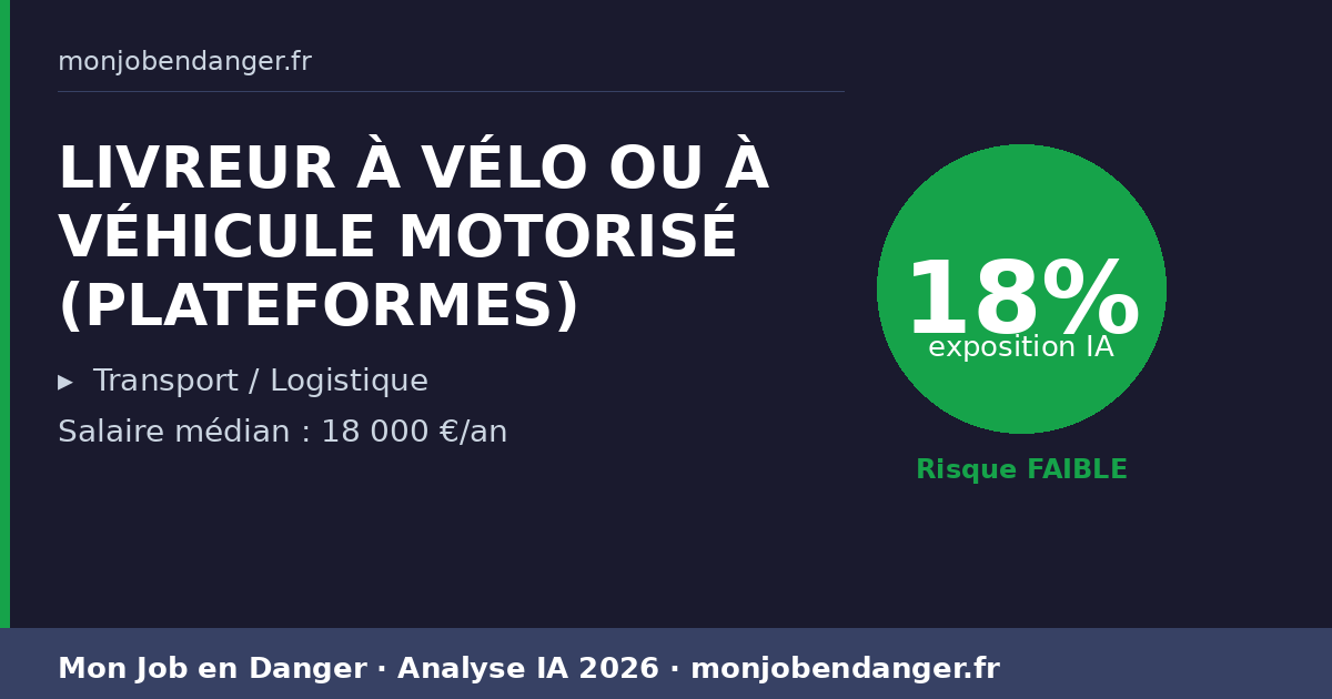 Avec seulement 18% d’exposition, les LIVREURs À VÉLO OU À VÉHICULE MOTORISÉ (PLATEFORMES) bénéficient d’une forte résilience face à l’IA. La dimension physique, relationnelle ou créative de ce métier le protège naturellement.