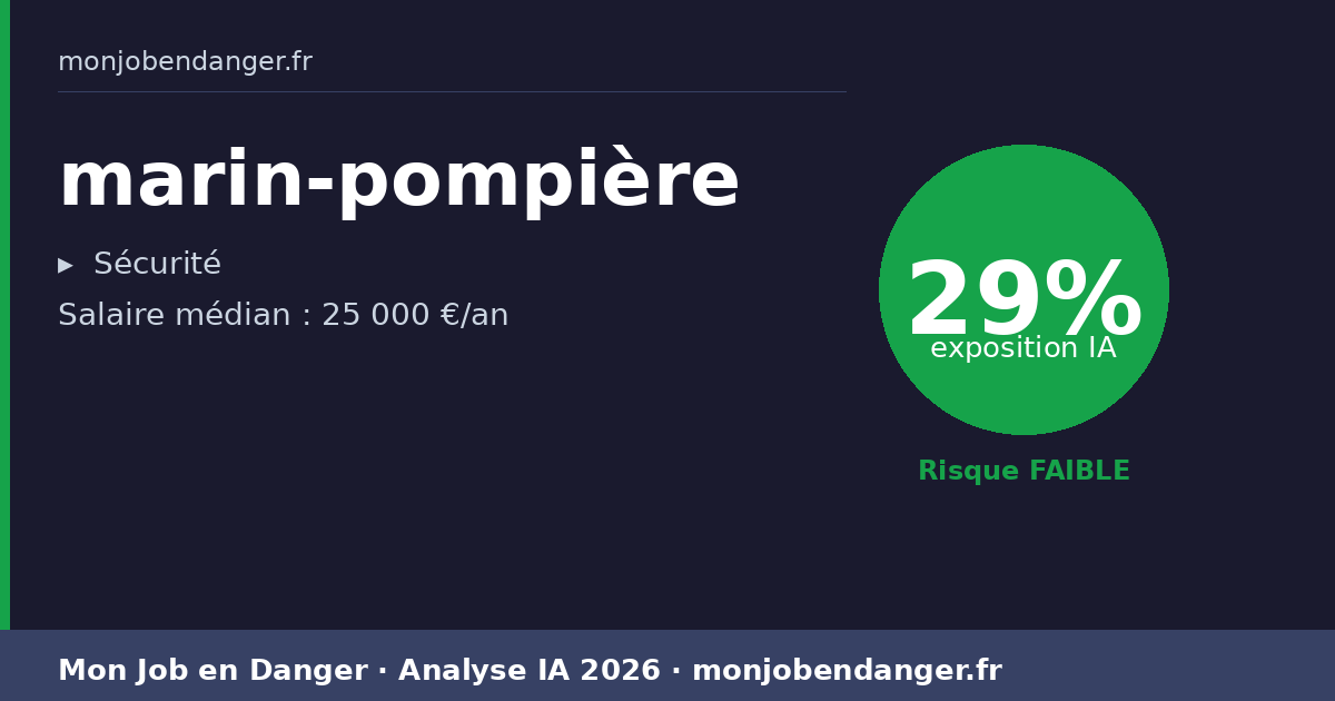 Avec seulement 29% d’exposition, les marin-pompières bénéficient d’une forte résilience face à l’IA. La dimension physique, relationnelle ou créative de ce métier le protège naturellement.