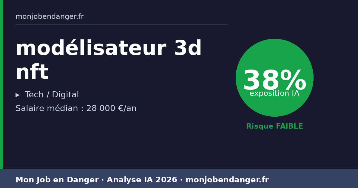 Avec seulement 38% d’exposition, les modélisateurs 3d nft bénéficient d’une forte résilience face à l’IA. La dimension physique, relationnelle ou créative de ce métier le protège naturellement.