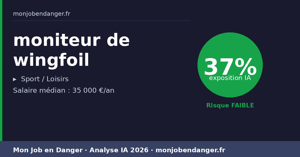 Dimensions d’exposition IA pour moniteur de wingfoil : Rédaction & communication: 33%, Données & analyse: 23%, Code & raisonnement: 13%, Design & création: 8%, Travail physique: 21%, Relations humaines: 39%.