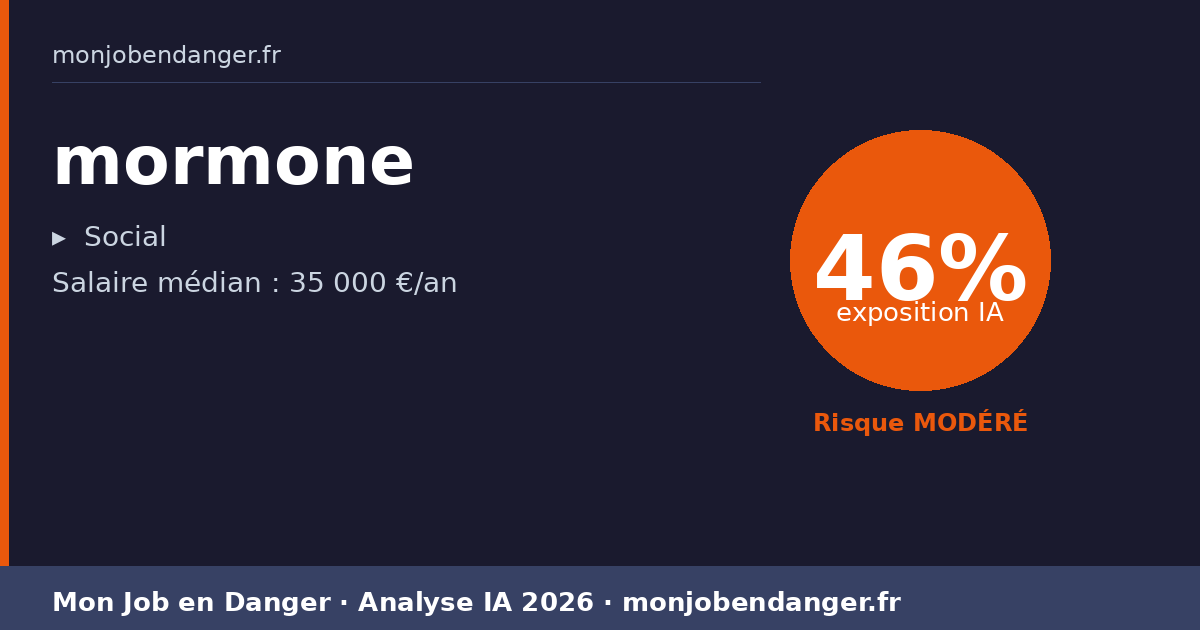 Dimensions d’exposition IA pour mormone : Rédaction & communication: 39%, Données & analyse: 29%, Code & raisonnement: 20%, Design & création: 7%, Travail physique: 27%, Relations humaines: 40%.