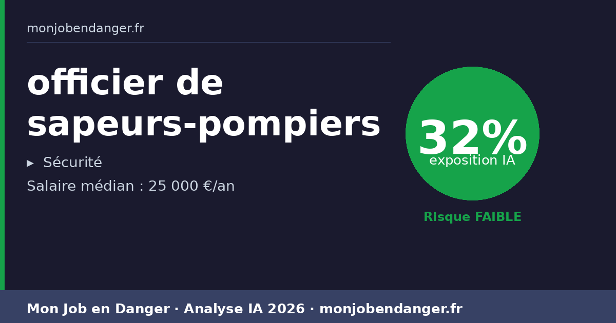 Avec seulement 32% d’exposition, les officier de sapeurs-pompiers bénéficient d’une forte résilience face à l’IA. La dimension physique, relationnelle ou créative de ce métier le protège naturellement.