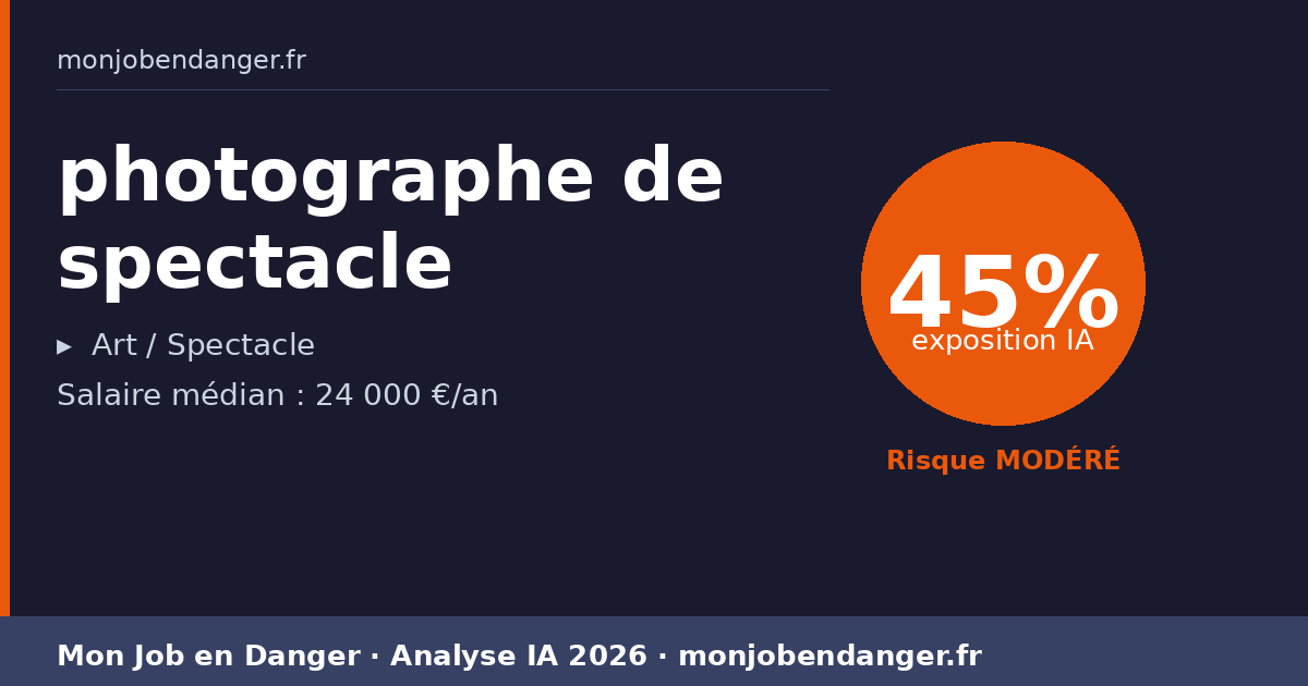 À 45% d’exposition, les photographes de spectacle vivent une mutation progressive. Certaines tâches seront assistées par l’IA, d’autres resteront pleinement humaines. Votre meilleure stratégie : adopter les outils IA pour amplifier votre productivité.