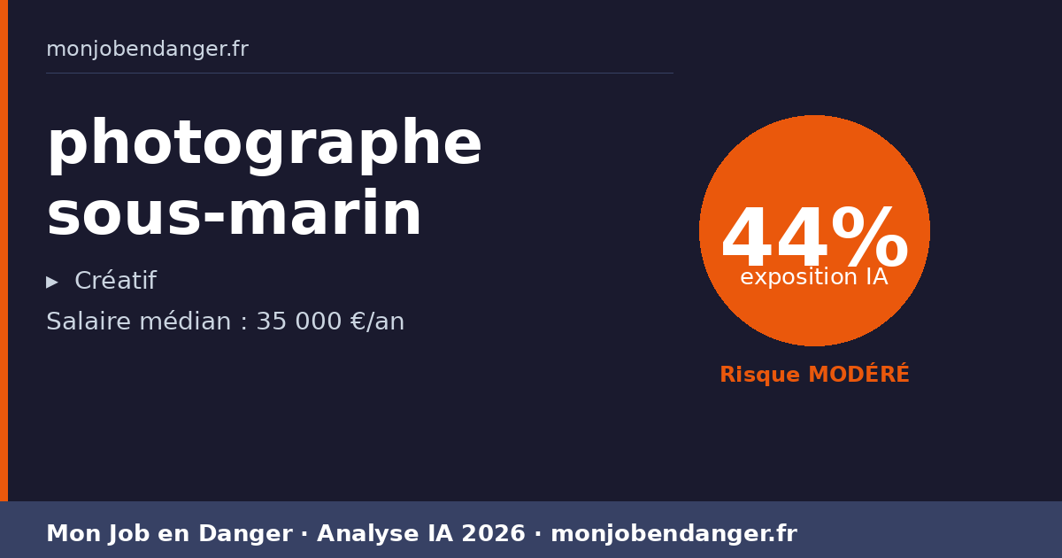 À 44% d’exposition, les photographes sous-marin vivent une mutation progressive. Certaines tâches seront assistées par l’IA, d’autres resteront pleinement humaines. Votre meilleure stratégie : adopter les outils IA pour amplifier votre productivité.