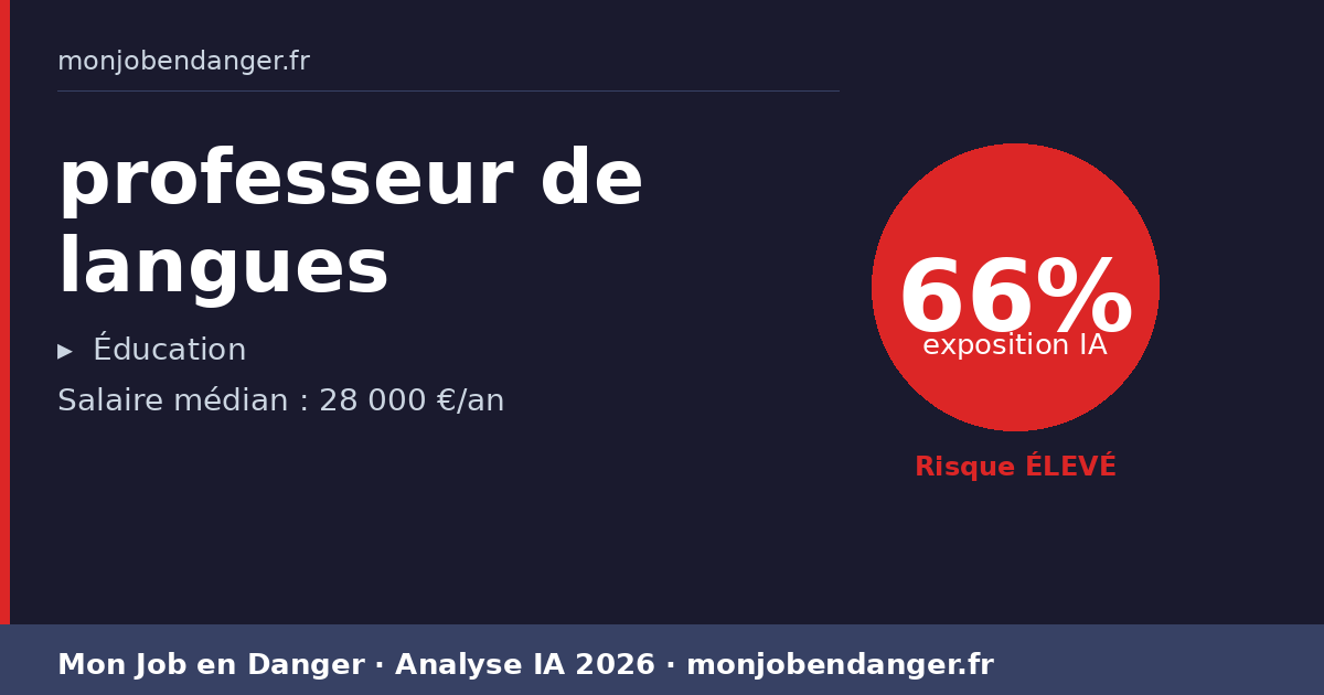 Salaire médian actuel : 28 500 €. Réaliste. Les professeur de langues qui adoptent les outils IA en premier gagnent en productivité et peuvent négocier en position de force.
