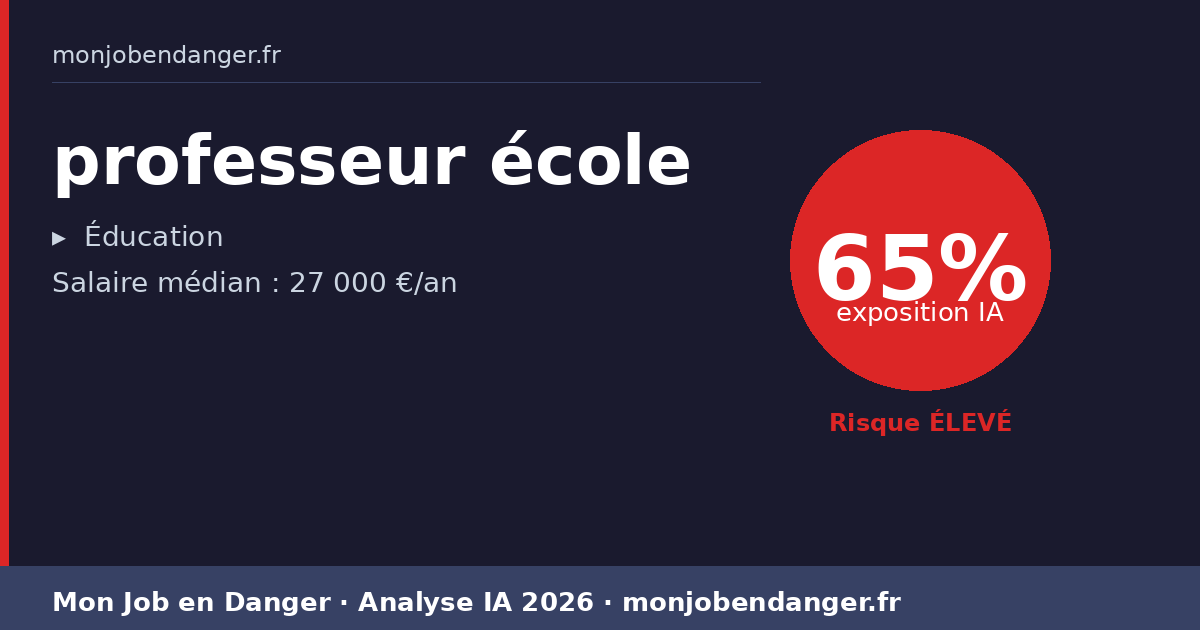 Salaire médian actuel : 27 300 €. Réaliste. Les professeur école qui adoptent les outils IA en premier gagnent en productivité et peuvent négocier en position de force.