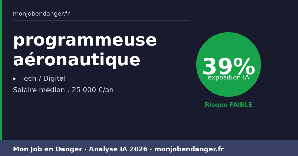 Avec seulement 39% d’exposition, les programmeuses aéronautique bénéficient d’une forte résilience face à l’IA. La dimension physique, relationnelle ou créative de ce métier le protège naturellement.