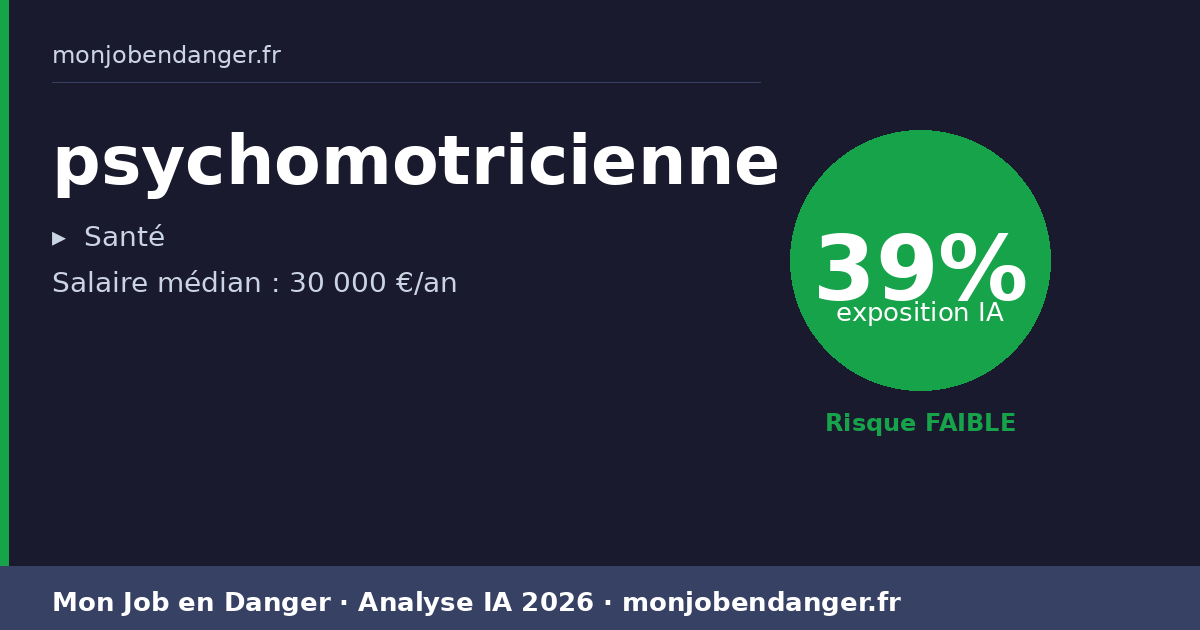 Avec seulement 39% d’exposition, les psychomotriciennes bénéficient d’une forte résilience face à l’IA. La dimension physique, relationnelle ou créative de ce métier le protège naturellement.
