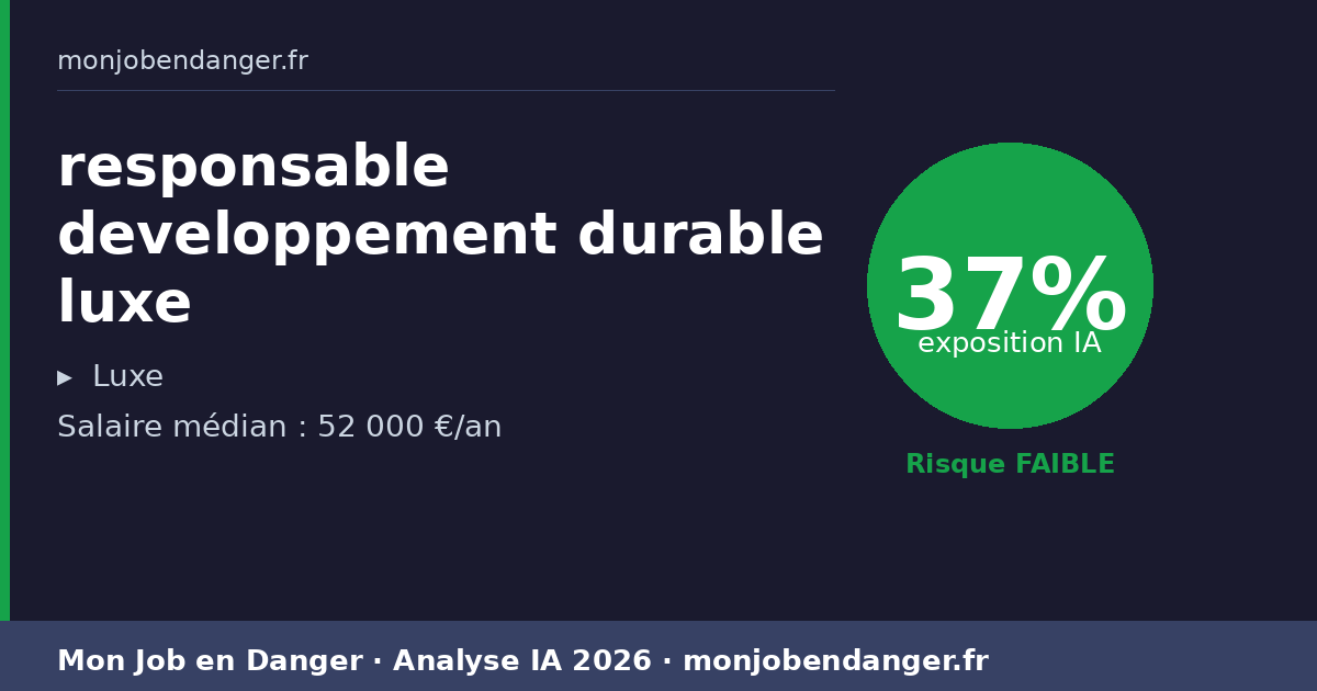 Avec seulement 37% d’exposition, les responsables developpement durable luxe bénéficient d’une forte résilience face à l’IA. La dimension physique, relationnelle ou créative de ce métier le protège naturellement.