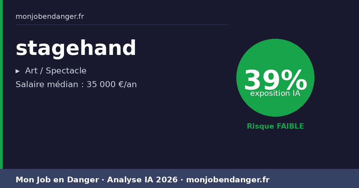 Avec seulement 39% d’exposition, les stagehands bénéficient d’une forte résilience face à l’IA. La dimension physique, relationnelle ou créative de ce métier le protège naturellement.