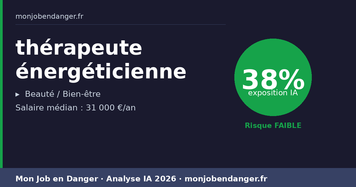 Avec seulement 38% d’exposition, les thérapeutes énergéticienne bénéficient d’une forte résilience face à l’IA. La dimension physique, relationnelle ou créative de ce métier le protège naturellement.